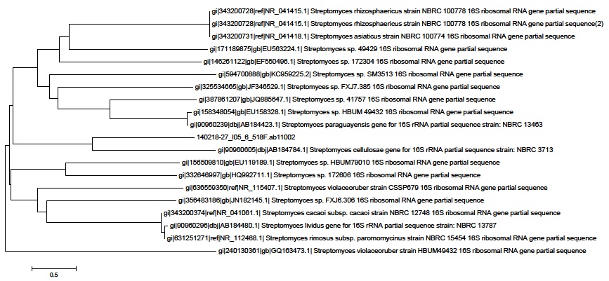 The genomic DNA used for the PCR (Polymerase Chain Reaction) was prepared from the colonies grown on YMD agar for 3 days. The total genomic DNA extracted from the strain was isolated by employing the DNA purification Kit (Pure Fast® Bacterial Genomic DNA purification kit, Helini Bio molecules, India) according to the manufacturer protocol. The 16S rRNA gene fragment was amplified using Actino specific forward Primer-5'-GCCTAACACATGCAAGTCGA-3' and actino specific reverse primer-5'-CGTATTACCGCGGCTGCTGG-3'. Conditions of the PCR were standardized with initial denaturation at 94 °C for 3 min followed by 30 cycles of amplification (Denaturation at 94 °C for 60 sec, annealing temperature of 55 °C for 60 sec and extension at 72 °C for 60 sec) and an addition of 5 min at 72 °C as final extension. The amplification reactions were carried with a total volume of 50 µl in a Gradient PCR (Eppendorf, Germany). Each reaction mixture contained 1 µl of DNA, 1 µl of 10 p mol forward 16S Actino specific primer (5´-AAATGGAGGAAGGTGGGGAT-`3), 1 µl of 10 pmol reverse 16S Actino specific primer (5´-AGGAGGTGATCCAACCGCA-`3), 25 µl of Master Mix and 22 µl of molecular grade nuclease free water. The separation was carried out at 90 Volts for 40 min in TAE buffer with 5 µl of Ethidium bromide. PCR product was analyzed using 1 % agarose gel and the fragment was purified (Helini Pure Fast PCR clean up kit, Helini Bio molecules, India) as per the manufacturer’s instructions. The bands were analyzed under UV light and documented using Gel Doc. The direct sequencing of PCR products was performed by dideoxy chain termination method using 3100-Avant Genetic Analyzer (Applied Bio systems, USA). The sequences thus obtained were analyzed for homology using BLASTN (Entrez Nucleotide database). The deduced 16s rDNA sequence was compared with the sequences in GenBank (http://www. ncbi. nlm. nih. gov/) using the Basic Local Alignment Search Tool (BLAST) then aligned with the related reference sequences retrieved from GenBank databases using the Clustal W method. Phylogenetic and molecular evolutionary analyses were conducted using MEGA (Melecular Evolutionary Genetic Analysis) version 6.0 [24].