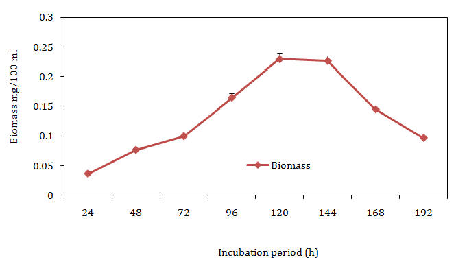 To determine the growth pattern, the strain was inoculated into 250 ml flasks containing 100 ml YMD broth and incubated at 30±2 °C on a rotary shaker at 180 rpm. The flasks were harvested at 24 h interval and the growth of the strain was determined by taking the dry weight of biomass. The culture filtrates obtained after separating the biomass were extracted with ethyl acetate and antimicrobial activity of crude extract was determined by agar well diffusion method.