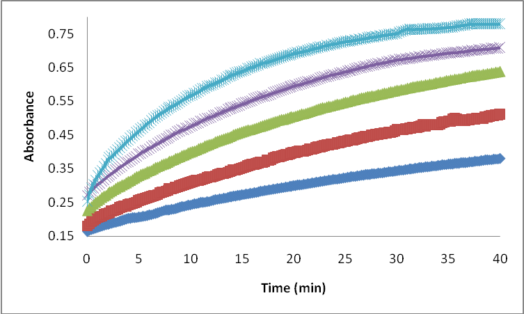 Method A: different volumes of 200 μg/ml GT solution were pipette in a series of 10 ml volumetric flasks, then 2 ml of NaOH solution and 1.5 ml KMnO4 solution were added then the volume were completed to 10 ml by distilled water, the mixture is in a water bath at 40 °C, then the solution mixture was transferred immediately into the spectrophotometer cell for absorbance monitoring at 610 nm during 40 minutes at controlled temperature. The absorbance change with time during the reaction progress is obvious in (fig. 2), and it is clear that the absorbance increase as the initial concentration of GT increases. For the initial-slope method calibration curve was constructed for Gentamicin by plotting the logarithm of the initial rate versus the logarithm of initial concentration of GT, the results shown in (fig. 3) illustrate good linearity in the range of 20-125 μg/ml.