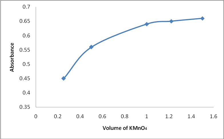 Fig. 5: Effect of KMnO4 volume on the absorbance at 610 nm as a result of the reaction with 50 μg/ml of GT in NaOH solution