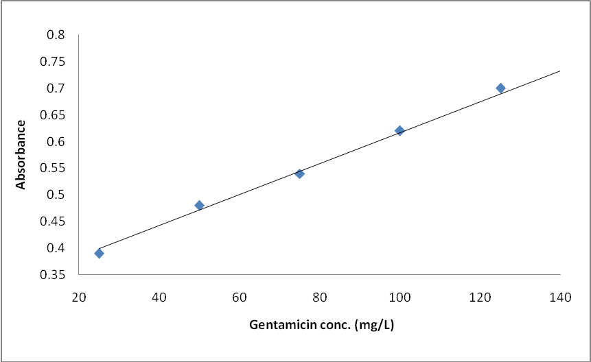 A Stock solution of 200 μg/ml of (GT) was prepared daily by dissolving appropriate amount of gentamicin sulfate in double distilled water, then the solution was used to prepare different concentrations by dilution. Potassium permanganate regent was prepared by dissolving 0.20 grams in 250 ml volumetric flask with distilled water, standardized, then it was used to prepare different appropriate solutions. A stock standard of 0.2 M sodium hydroxide solution was prepared in distilled water.