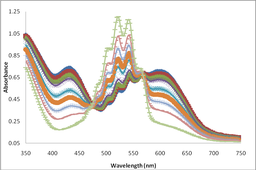 Fig. 7: Absorption spectra of GT solution during the reaction with KMnO4 in NaOH solution after five minutes intervals