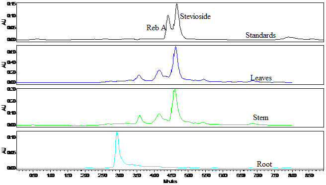 In the present study, two standard compounds viz. Stevioside and rebaudioside A (Reb A) procured from Sigma-Aldrich was used for qualitative and quantitative analysis of plant secondary metabolites. These two glycosides were selected for quantitative estimation on the basis of occurrence in the plant. Fig. 1 showed the qualitative estimation of Reb A and Stevioside where the presence of metabolites was inferred from the similar retention time of Standard compounds with samples. In stem and leaves extract of Stevia peaks of sample matches with the standard compounds, but root extract of S rebaudiana does not contain any of the metabolites as no peak matches with the standard compound.