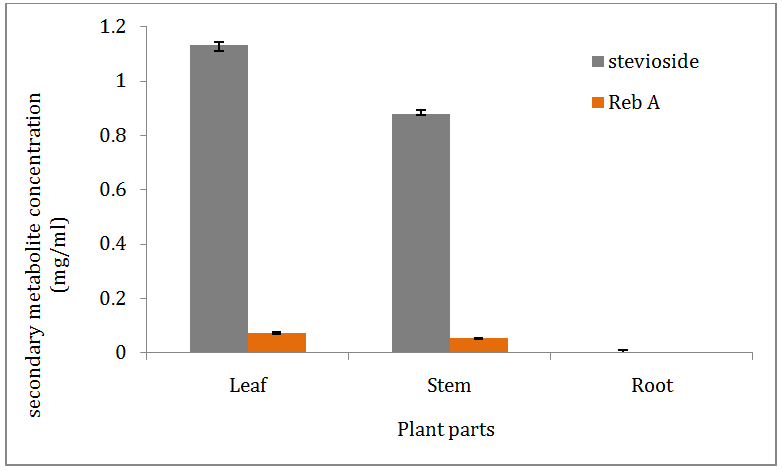 Current study reveals that different plant parts (leaves stem and root) possess phytochemicals which are responsible for plants therapeutic properties. Stevia leaf extract showed the presence of most of the phytoconstituents. These phytoconstituents possess different bioactivities which can be utilized further. Quantitative analysis through HPLC reveals that the leaves of Stevia contain both the secondary metabolites (Stevioside and Reb A) in higher amount when compared with stem extract. Leaf extract possesses 1.2 fold higher stevioside than stem extract. Further, isolated secondary metabolites can be purified and investigated for their bioactivities. Leaves of Stevia can be utilized for large scale production of stevioside and Reb A.