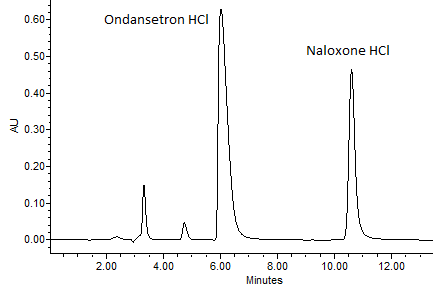 Fig. 1: High-performance liquid chromatography analysis of an injection combination containing ondansetron hydrochloride (0.4 mg/ml) and naloxone hydrochloride (0.2 mg/ml) in 0.9% water of injection (sodium chloride) after 24 hours storage at 37 ˚C