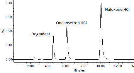 Fig. 2: High-performance liquid chromatography analysis of an injection combination containing ondansetron hydrochloride (0.4 mg/ml) and naloxone hydrochloride (0.2 mg/ml) in 0.9% water of injection (sodium chloride) after 8 days storage at 37 ˚C