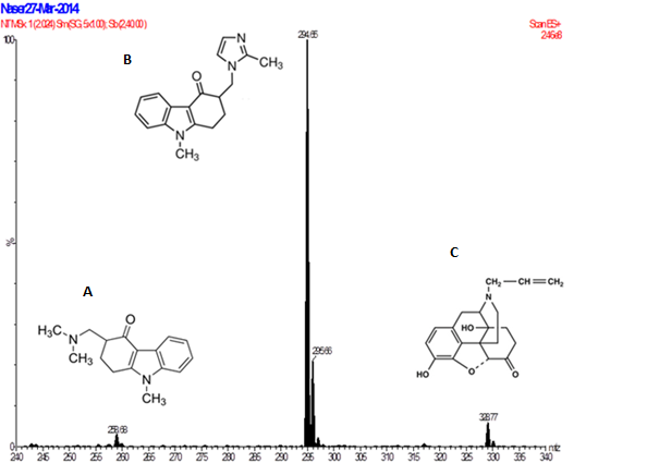 Fig. 3: Full scan ESI mass spectrum of A-3[(dimethylamino) methyl]-1,2,3,9-tetrahydro-9-methyl-4H-carbazol-4-one B-Ondansetron C-Naloxone