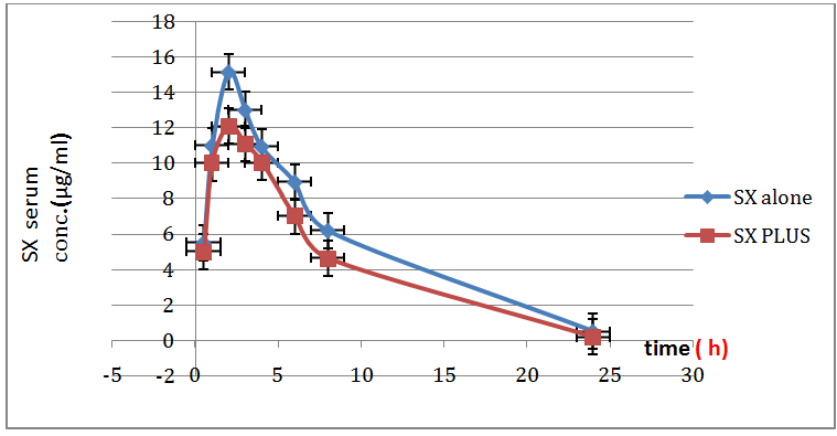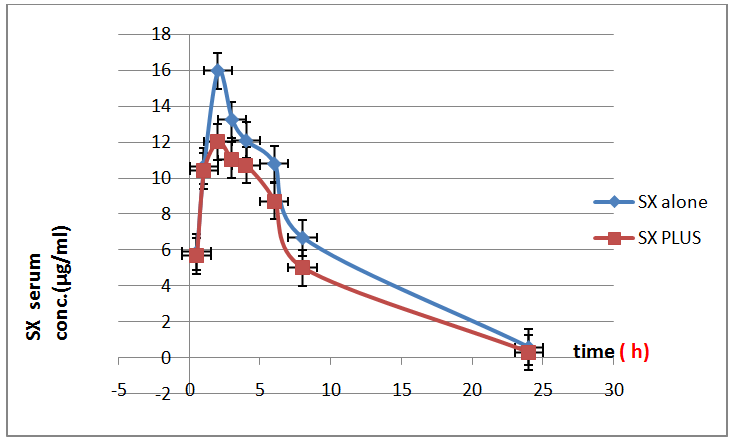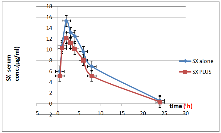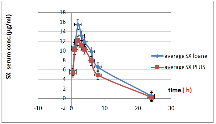 Fig. 9: Serum concentration–time profile graph (0-24) h of oral administration of drug, (SX = saxagliptin alone, SX Plus = saxagliptin with sucralose)