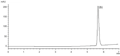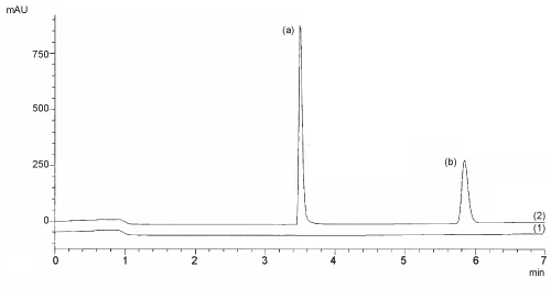 Fig. 10: Blank chromatogram (1) and separation chromatogram (2): Saxagliptin (b peak) and internal standrad slidenafil citrate (a peak) chromatogram