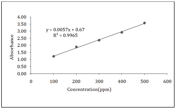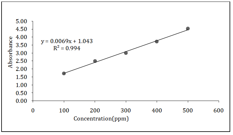 The five-point calibration graph was drawn by plotting absorbance v/s concentration. The graph achieved was linear, it showed an acceptable correlation between absorbance and concentration with the correlation coefficient R2=0.99 and the regression equation (y= 5.74x+0.644) for sodium benzoate and the correlation coefficient R2=0.99 and the regression equation (y=6.85x+1.043) for potassium sorbate. It was shown in [fig. 1, 2]. The precision and accuracy of the method have been considered within the day assay and between days assay for both the preservatives. The reported standard deviation was less than 2 which indicates that the method was precise.
