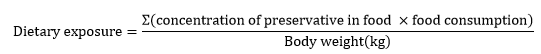 For assessing the dietary exposure, TDS has conducted. It includes some of the parameters such as determining food preservative concentration data, mode of expressing and variability in preservative concentration data, classification of school children into different age groups and conducting 24-hour diet recall method. The 24-hour diet recall method involves step by step procedure starting from interviewing the children, collecting the amount of food intake in detail, collecting meal information such as name, time and location, reporting food additions, reviewing the collected information and ending the interview. Then, the individual consumption data were reported and estimated the mean daily intake of these preservatives. The chronic dietary exposure was calculated on per kilogram of body weight basis. Each individual’s total dietary exposure to food chemical preservatives from all foods is divided by their own body weight. After estimation, these were compared to reference health standards to assess the potential risk to children by considering the acceptable daily intake (ADI) [25].