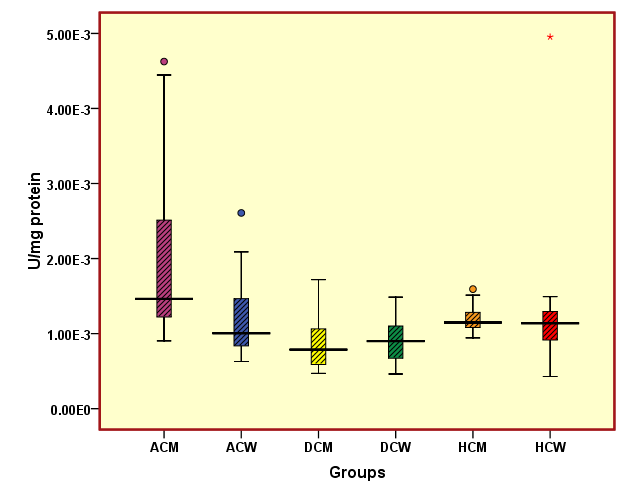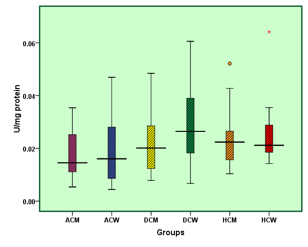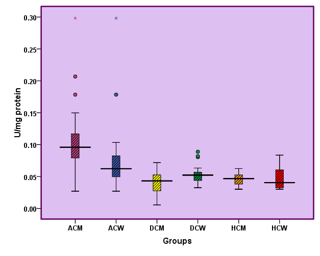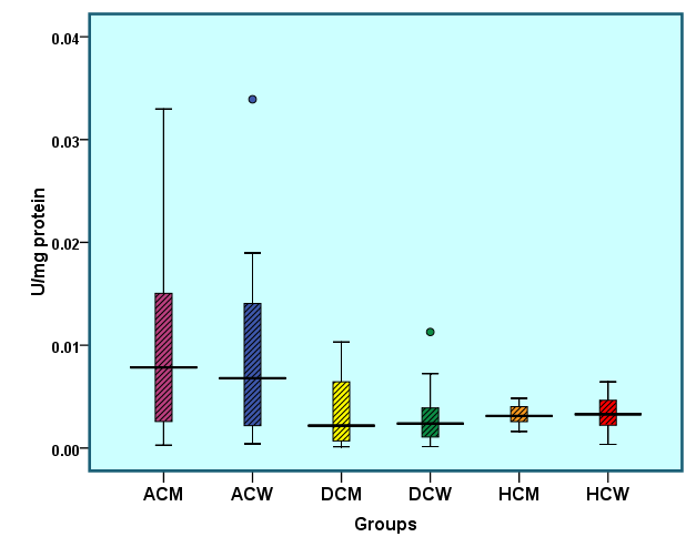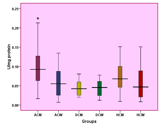 Values are expressed by Median (25th, 75th quartile), p<0.05, Superscript a denotes significant difference between ACM and groups ACW, DCM, DCW, HCM, HCW, Superscript b denotes significant difference between ACW and groups DCM, DCW, HCM, HCW, Superscript c denotes significant difference between DCM and groups DCW, HCM, HCW, Superscript d denotes significant difference between DCW and groups HCM, HCW, ACM: Apparently Normal Cataract Men (n=20) ACW: Apparently Normal Cataract Women (n=20), DCM: Diabetic Cataract Men (n=20) DCW: Diabetic Cataract Women (n=20), HCM: Hypertensive Cataract Men (n=20) HCW: Hypertensive Cataract Women (n=20)