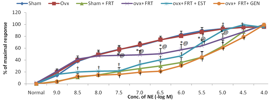In the present study, treatment of FRT-induced insulin resistant ovariectomized rats with either EST or GEN for three weeks decreased the vascular responsiveness towards NE as compared to the respective insulin resistant ovariectomized untreated group. This result was consistent with other studies which showed a significant decrease in contractile response of rat tail artery towards NE, after intravenous injection of EST [55]. Pretreatment with EST also decreased contractile responses towards NE in the tail artery [56]. The inhibitory effect of EST on the pressor responses to NE may be related to its modulation of VSMC intracellular free Ca2+ through its actions on membrane Ca2+channels [55].