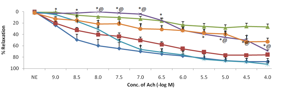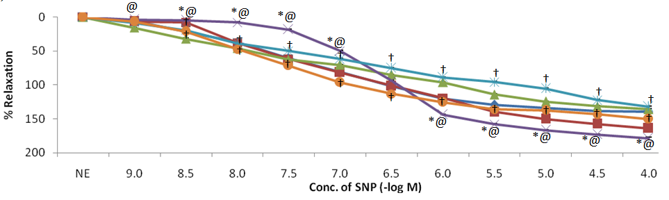 NE, Ach, and SNP were freshly prepared by dissolving them in Kerbs’ solution. Serial dilutions of each vasoactive agent were prepared such that cumulative additions to the bath gave a final bath concentration ranging from 10-9M to 10-4M. For testing the relaxant effects of Ach or SNP, pre-contraction with NE was carried out first with a concentration that produce approximately 60-70% of the maximum contractile response. Contractile responses to NE were expressed as percentage of maximal response while relaxant responses to the vasodilators Ach and SNP were expressed as percentage relaxation of the pre-contraction value.