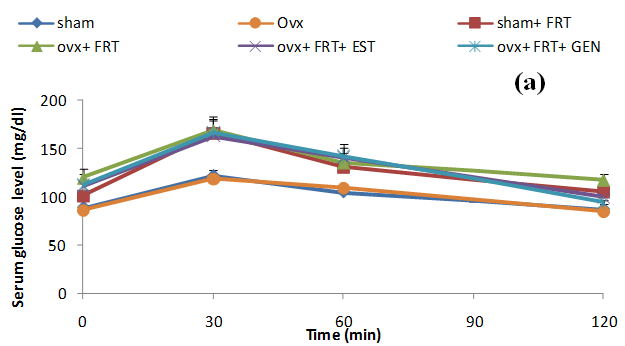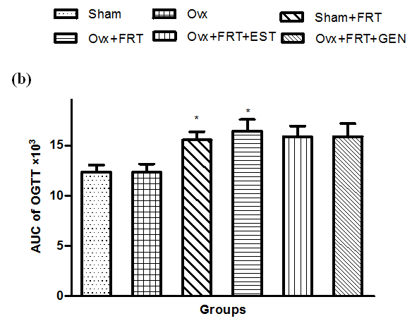 Fig. 2: Effects of 17-β estradiol and genistein on oral glucose tolerance test (a) and its area under the curve (b) in insulin-resistance ovariectomized rats