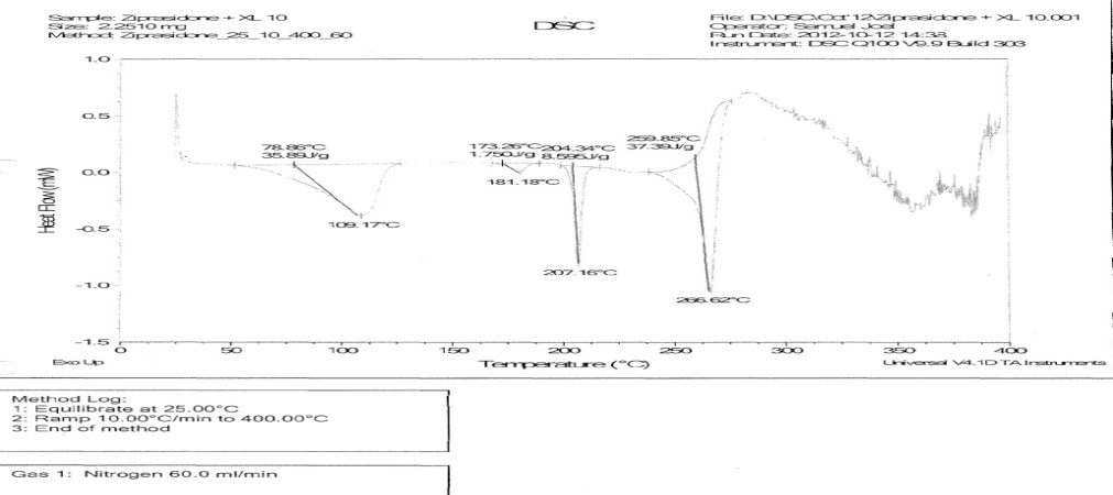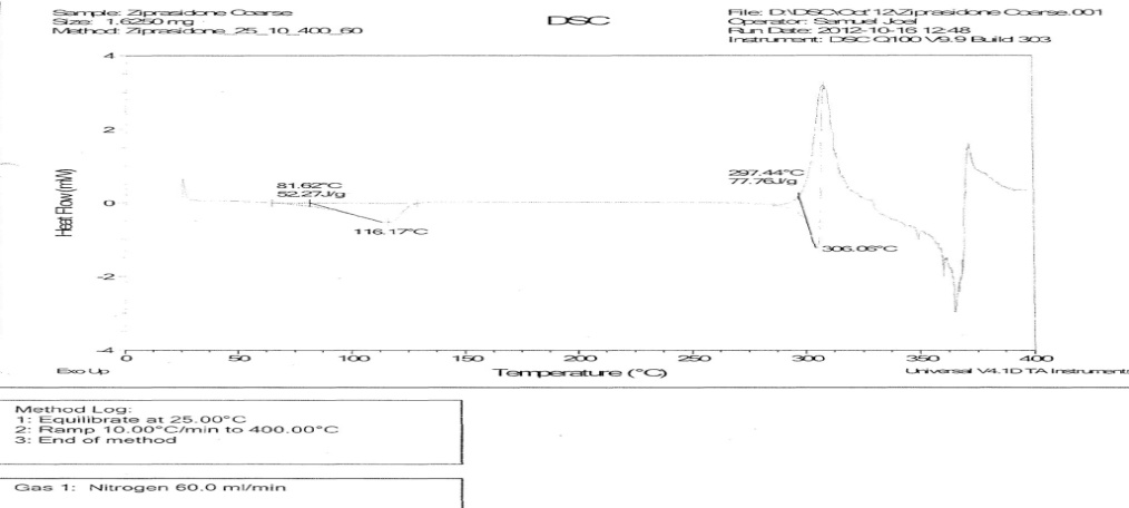 Fig.4 and Fig.5 show DSC thermo-grams of pure ZIP and the finest ZIP nanocrystals [F2] respectively. The pure ZIP showed a typical endothermic peak at 60.910c, which corresponds to its melting point and the finest ZIP nanocrystals[F2] showed an endothermic peak at 55.80c.