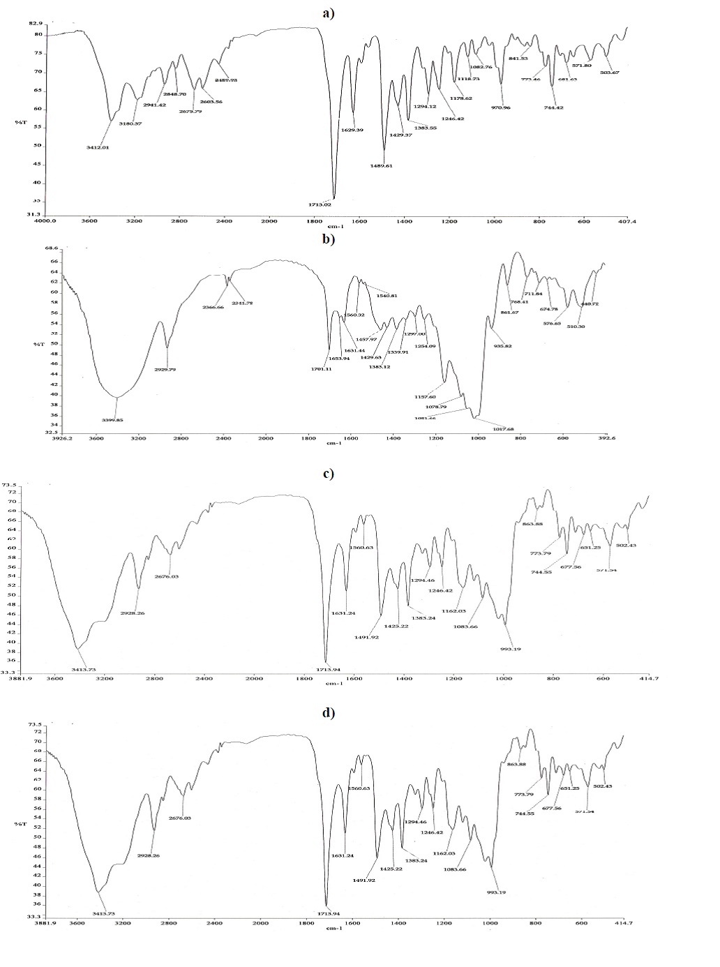 Fig. 6: (a) FTIR of ZIP alone (b) FTIR of ZIP with tween (c) FTIR of ZIP with kollidone (d) FTIR of ZIP nanocrystals