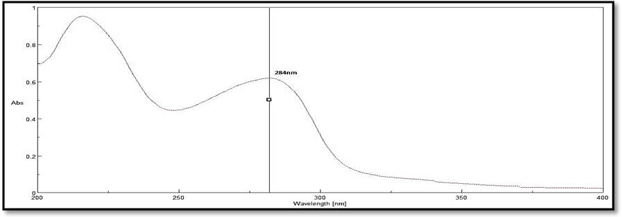 The UV absorbance spectrum of Famotidine and Rabeprazole is shown in fig. 3 and fig. 4. From the spectrum the wavelengths selected for estimation of drugs were 263 nm as λmax of Famotidine and 284 nm as λmax of Rabeprazole.