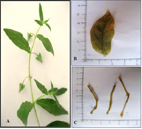 The Macroscopic studies of leaves and stem are depicted in fig. 1.Leaves are green in color, tasteless odorless. The leaves were observed to be simple, sessile, with acuminate apex, entire margin, and pinnate venation. Surface of leaves are covered with prominent white tubercles reach with hairs. They are 3.8–10.0 cm long and 0.6–5.0 cm in width. The shape of leaf is ovate or oblong with cordate base. The stem are found to be green in color, light brown when dry surface, odourless, tasteless hairy surface, branches clothed with spreading trichomes. They are 50 cm long and 0.2 to 0.3 cm in width.