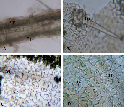 (A) Lamina portion of leaf [100x], Upl-upper palisade layer, Lpl-lower palisade layer, (B) Trichome [100x], Tri-Trichome, (C) Upper surface preparation [100x], (D) Lower surface preparation [100x], S1-Anisocytic stomata, S2-Annomocytic stomata