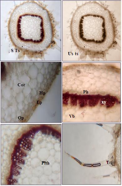 S Ts-Stained T. S. of stem [100x], Us ts-Unstained T. S. of stem [100x], Op-Outer portion of stem, Ep-epidermis, Hp-hypodermis; Cor-cortex, Vb-Vascular bundle, Xy-xylem, Ph-phloem, Tri-trichome