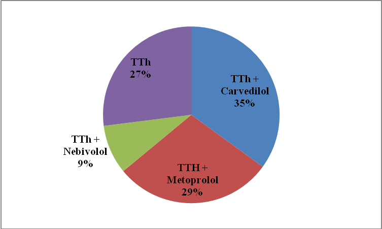 Mean age of First group: traditional therapy (TTh)+carvedilol, was 59.6 years±9.86; Mean age of Second group: TTh+metoprolol, 58.5 years±10.3, Mean age of Third group: traditional therapy+Nebivolol, mean age 62 years±9.36Mean age of Fourth group: only TTh(Diuretics, ACEI/ARB, Digoxin) was 63.9±10.3, without any statistical difference between them (p=0.071).