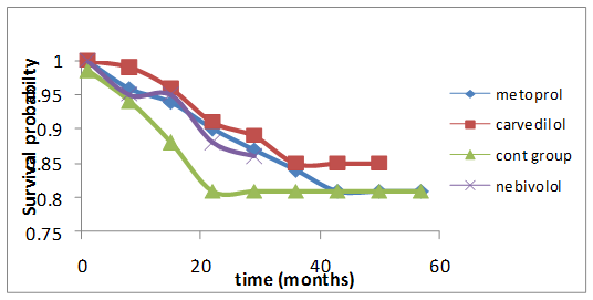 The number of deaths was higher in the control group, 10 (15.4%), in Metoprolol group was 8 (11.4%), and in Carvedilol group was 5(6%); p=0.001. There were not deaths in Nebivolol group. The number of patients in this group is smaller than the other groups. (21 patients only). The function of survival was performed with KAPLAN-Meier method for the entire sample as well as for special subgroups to compare them.