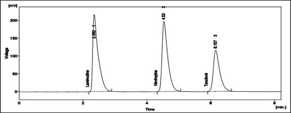 The chromatographic conditions were optimized with a view to develop a reverse phase LC assay method. No internal standard was used, and no extraction or separation step was not involved. The optimization of the method parameters was done by fixing one variable and changing the other variables among mobile phase composition, flow rate and pH of the mobile phase. Tenofovir disoproxil fumarate, lamivudine, and nevirapine are partially soluble in water and freely soluble in organic solvents, such as methanol and acetonitrile. Among the different combinations for the solvent system, acetonitrile and phosphate buffer, pH 3.0, was preferred as the mixture, resulted in greater response to this drug combination after several preliminary investigatory runs. The pH of mobile phase was found to be critical because the peak obtained above pH 3.0 of buffer was irregular and asymmetric. Changes in the concentration of organic modifier often lead to significant changes in separation selectivity. Increasing in the buffer content in mobile phase resulted in a decrease in the retention time of the drugs. Therefore, a high buffer concentration was used at a flow rate of 1.0 ml/min. The peak shape and symmetry were found to be good when mobile phase composition of 60:40 (v/v) of phosphate buffer and acetonitrile was used at a flow rate of 1.0 ml/min at ambient temperature. Under these conditions, the analyte peak was well defined with very good symmetry, free from tailing and retention time of lamivudine, nevirapine, and tenofovir disoproxil fumarate was found to be at 2.350, 4.533 and 6.157 min respectively. The optimized chromatogram of proposed method was shown in fig. 2 and system suitability parameters reported in table 1. The method presents advantages over previously published methods by the usage of readily available mobile phase phosphate buffer and acetonitrile with UV-detector and short retention time enabled the analysis of a large number of samples with a small quantity of mobile phase, leading to its cost effectiveness. The results obtained from assay values were in good agreement with the labeled amount of the marketed tablet dosage form RICOVIR-LN (table 2).
