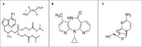 Fig. 1: Chemical structures of tenofovir disoproxil fumarate (A), Nevirapine (B) and Lamivudine (C)