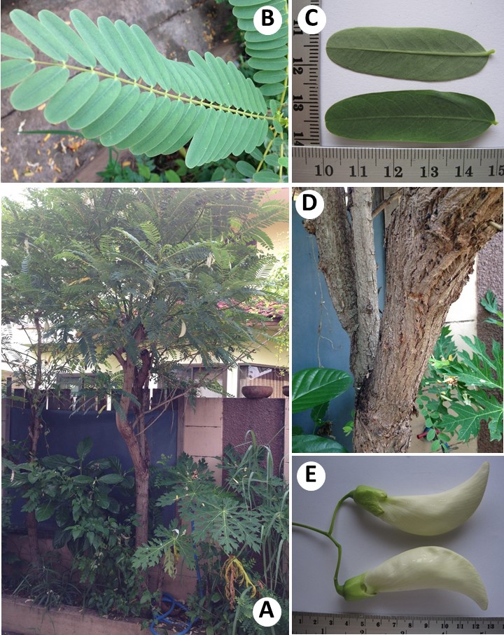 S. grandiflora is a small, erect, fast-growing perennial (4-5 m in just 6 months), and sparsely branched tree that reaches 10-15 m in height and a diameter up to 12 cm (fig. 1A) [28]. Leave: The leaves are pari-pinnately compound up to 15-25 cm long with 20-50 leaflets in pairs, dimensions 12-44x5-15 mm, oblong to elliptical in shape and opposite arrangement. Single leaflet is 2-4 cm long and 10-15 mm in breadth, linear, oblong, mucronate, deciduous, stipulus lanceolate or setaceous deciduous (fig. 1B-C) [31, 32]. Stem: The bark is light gray, corky and deeply furrowed and the wood is soft and white (fig. 1D). Flower: The flower clusters hanging at the leaf base. They are fleshy with 2-5 large or giant showy white petals. They are 7.5-10.0 cm long with short axillary racemes, curved about 3 cm wide before opening. Flowers are arrangement to pea flowers with five petals that are differentiated into a standard, wing, and keel petals. The standard petal is usually upright, the wing petals spread out on either side of the flower, and the keel is boat-shaped and in this species is curved down and away from the flower (fig. 1E). Fruit: The fruit looks like flat, long and thin green beans. Pod is sub-cylindrical, straight or slightly curved up to 30-45 cm long and 5-8 mm wide, straw-colored or reddish-brown, containing from 15-50 pale-colored seeds. Seed: The seed is 3-4.5 mm x 2 mm x 2 mm, sub-cylindrical or bean like, elliptical, olive-green or red brown, 6-8 in a pod. There are 55-80 seeds per gram [33-35].