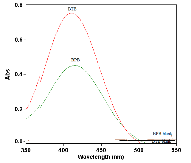 Fig. 2: Absorption spectrum of ion-pair complexes of (10 μg/ml) DNP and (1.0 x 10-3 mol/l) BTB and BPB reagents against reagent blank