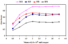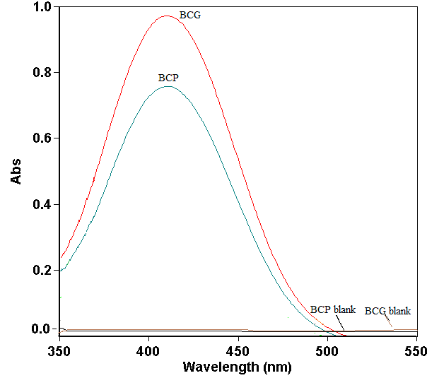 Where s is the standard deviation of the response of the blank or the standard deviation of intercepts of regression lines and k is the sensitivity, namely the slope of the calibration graph. In accordance with the formula, the limit of detection was found to be 0.16, 0.21, 0.19 and 0.25 µg/ml for BCG, BCP, BTB and BPB methods, respectively. The limit of quantitations was found to be 0.53, 0.80, 0.63 and 0.83 µg/ml for BCG, BCP, BTB and BPB methods, respectively (table 1).
