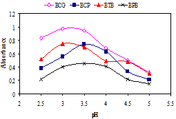 The effect of pH on the drug–reagent complex formation was studied by extracting the colored complexes in the presence of various buffers. It was noticed that the maximum color intensity and highest absorbance value were observed in NaOAc–AcOH buffer of pH 3.0 and 3.5 using (BCG or BTB) and (BCP or BPB) method, respectively (fig. 4). Buffer volume was determined by applying the same experiment and variation the volume regularly (0.5-4.0 ml). The higher absorbance value and reproducible results was obtained at using 2.0 ml of buffer solutions.