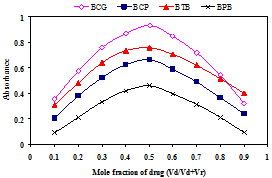 The molar ratio between DNP and dyes in the ion-pair complexes was determined by Job’s method of continuous variation [33]. Continuous variation method of equimolar solutions was employed: a 1.0 × 10−3 mol/l standard solution of drug base and 1.0 × 10−3 mol/l solution of dye were used. A series solution was prepared in which the total volume of drug and reagent was kept at 2.0 ml in the total volume of 10 ml of the aqueous layer. The absorbance of extracting ion-pair in each instance was measured at the optimum wavelength and plotted against the mole fraction of the drug. The results indicated that the molar ratio of (drug: dye) is (1:1) complex was formed through the electrostatic attraction between the positive charged DNP+ions and negatively charged BCG−, BCP−, BTB−and BPB-dye, (D−) ions (fig. 6).