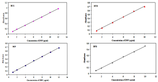 Fig. 7: Calibration curves for determination of DNP (1.0–12 μg/ml) with (BCG or BCP) and DNP (1.0–10 μg/ml) with (BTB or BPB)