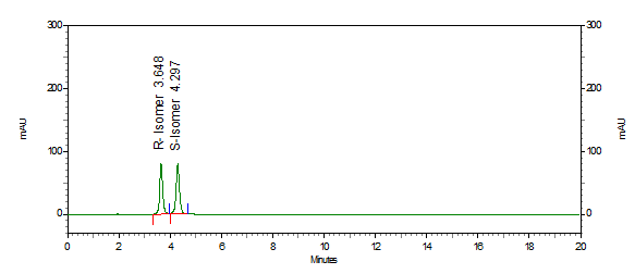 The chromatographic conditions were optimized using a Chiral-AGP (100 x 4.0 mm i. d, 5 µm) column. The mobile phase was 0.1 M Sodium dihydrogen phosphate dihydrate pH 4.0 with ortho phosphoric acid: IPA (85:15, v/v). Diluents 0.1 M Sodium dihydrogen phosphate dihydrate pH 4.0 with ortho phosphoric acid. The flow rate was set at 1.0 ml/min. The column was maintained at 25 ºC and the detection was carried out at a wavelength of 225 nm. The injection volume was 10 µl.