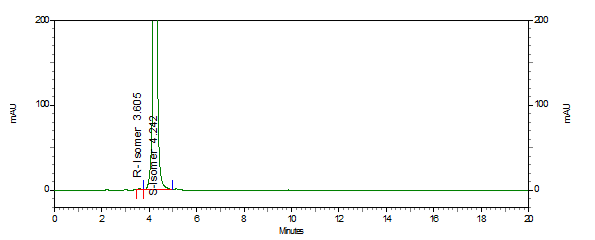 In order to determine the repeatability of the method, replicate injections (n=6) of a 0.1 mg/ml solution containing S-isomer spiked with R-isomer (0.5 %) was carried out. The intermediate precision was also evaluated over three days by performing six successive injections each day.