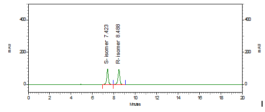 The chromatographic conditions were optimized using a Chiralcel OD-H (250 x4.0 mm i. d, 5 µm) column. The mobile phase was n-hexane: ethanol: trifluoroacetic acid (90:10:0.1, v/v/v). The diluent was ethanol: trifluoroacetic acid (100:0.1, v/v), the flow rate was set at 1.0 ml/min. The column was maintained at 30 °C and the detection was carried out at a wavelength of 210 nm. The injection volume was 20 µl.