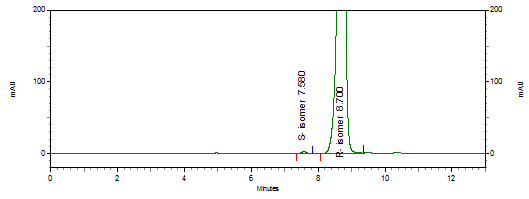 In order to determine the repeatability of the method, replicate injections (n=6) of a 10.0 mg/ml solution containing R-isomer spiked with S-isomer (0.5 %) was carried out. The intermediate precision was also evaluated over three days by performing six successive injections each day.