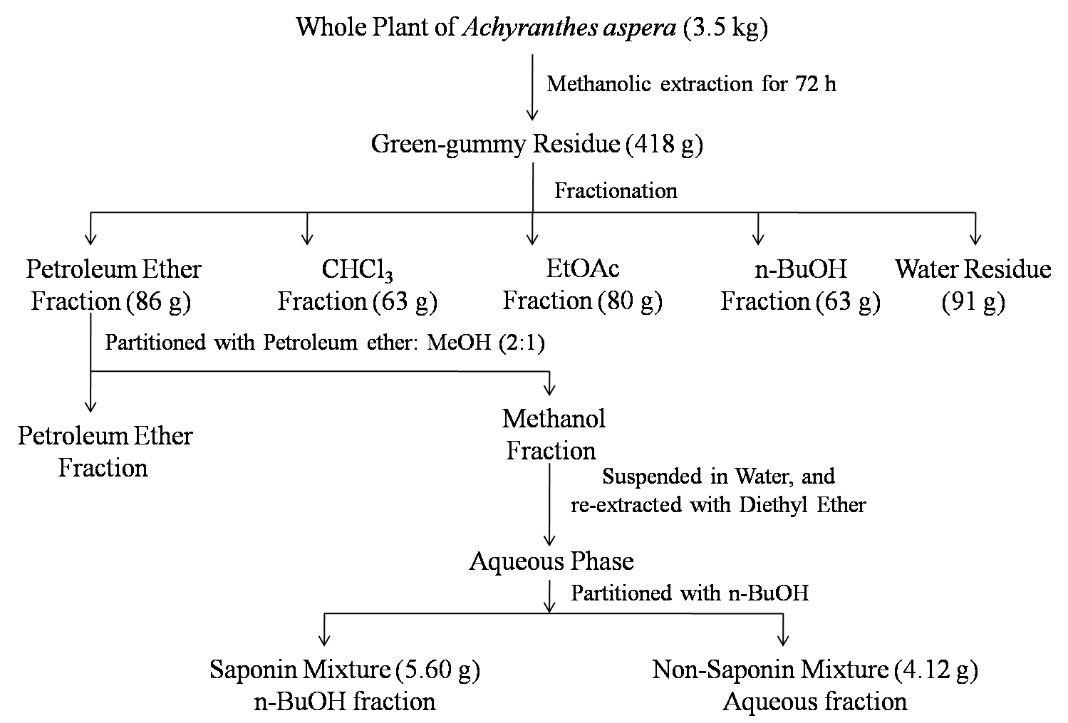 Air-dried and powdered whole plant (3.5 kg) of AA was extracted with Methanol in soxhlet apparatus for 72 h. Solvent was removed under reduced pressure yield 418 g of green gummy residue. The extract (400 g) was dissolved in water and partitioned with petroleum ether, chloroform, ethyl acetate and n-butanol, successively using a separating funnel. The partitioned fractions were further concentrated to give PAA (petroleum ether, 86 g), CAA (Chloroform, 63 g), EAA (Ethyl acetate, 80 g), BAA (n-butanol, 63 g) and AAA (aqueous residue, 91 g). PAA fraction showed significant inhibitory activity against carrageenan-induced paw edema than other fractions. Hence, PAA fraction was partitioned with methanol. Methanolic fraction was further taken up in water and re-extracted with diethyl ether until all chlorophyll pigments were removed. Then aqueous phase partitioned with n-butanol. The n-butanol fraction yield a saponin mixture (5.60 g) and aqueous residue yield non-saponin mixture (4.12 g). (fig. 1).