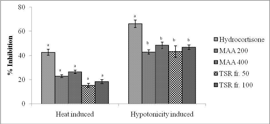 Fig. 2: Effect of methanolic extract and saponin rich fraction of A. aspera on heat and hypotonicity induced haemolysis. MAA 200 and 400: Methanolic extract of Achyranthes aspera (200 and 400 μg/ml), TSR fr. 50 and 100: Triterpenoid saponin rich fraction of 50 and 100 μg/ml. Values are mean±SEM (n=3); ap<0.001, b p<0.01 vs. control (no inhibition)