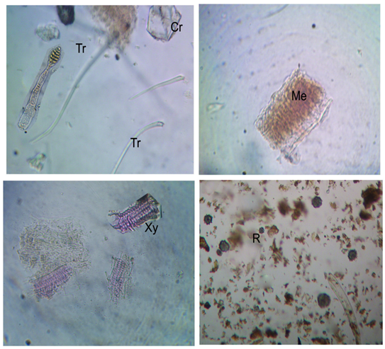Fig. 4: M: Mesophyll region; Tr: Trichomes; Xy: Xylem vessels; R: Rosette crystals Physico-chemical evaluations