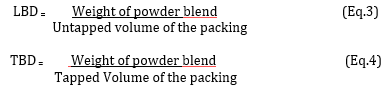 The Compressibility Index of the powder blend was determined by Carr’s compressibility index. It is a simple test to evaluate the LBD and TBD of a powder and the rate at which it packed down. The formula for Carr’s Index is as below: