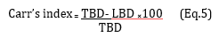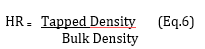 This was calculated as the ratio of tapped density to bulk density of the sample