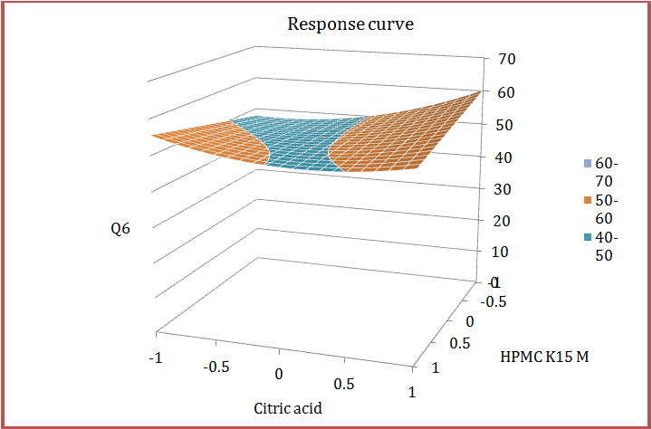 Fig. 1 shows the influence of content of HPMC K15M and citric acid on Q6. It was found that percentage drug release increase with decreases in content of HPMC K15M and citric acid. Although the content of HPMC K15M and citric acid significant influence on the Q6 it ranged from 43.99–57.87. From the graph, it is observed that percentage drug release at 6 hr (Q6) is increases.