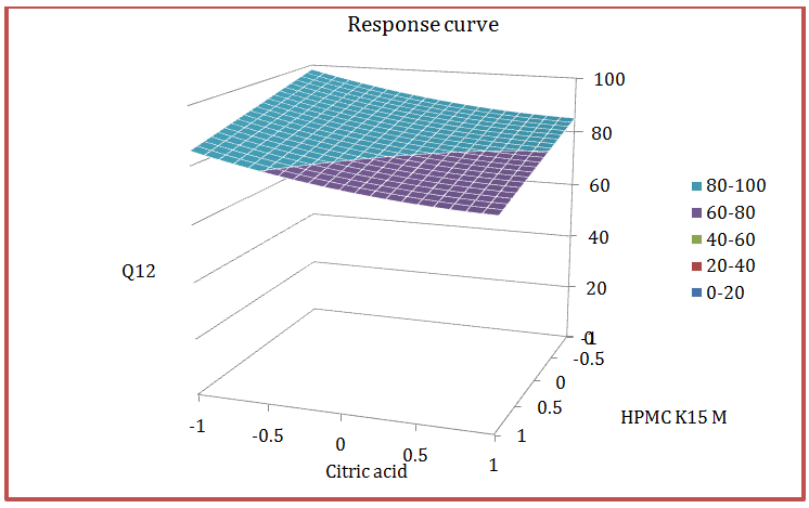 Fig. 2 shows multiple regressions analysis for percentage drug release at 12 hr (Q12) showed the significant contribution of both the factors on the response. Increasing the concentration of polymer (X2) and citric acid (X1) retardation of the drug release at Q12 is observed.