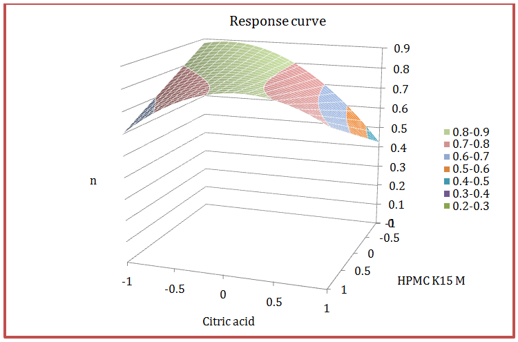 Fig. 3 shows the influence of content of HPMC K15M and citric acid on diffusion exponent. It was found that diffusion exponent rises with increase with content of HPMC K15M and citric acid. When the concentration of polymer is increased, the release of the drug tends to become slower. Although the content of HPMC K15M and citric acid significant influence on the diffusion exponent it ranged from 0.5614-0.9996, indicating anomalous drug release. Regarding the overall effect of both factors, it appeared that the diffusion exponent was affected more by the content of HPMC K15M, when concentration of polymer increases diffusion exponent decreases.