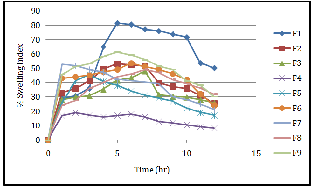 The swelling index was calculated with respect to time. As time increase, the swelling index was increased, because weight gain by tablet was increased proportionally with rate of hydration. Later on, it decreased gradually due to dissolution of outermost gelled layer of tablet into dissolution medium. The direct relationship was observed between swelling index and HPMC K15M increase, swelling index was increased.