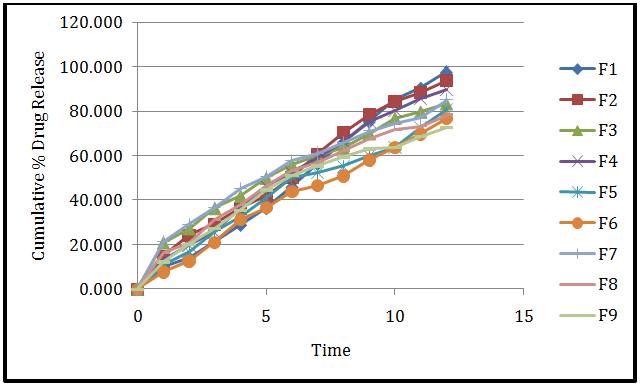 Large concentration of high viscosity polymer induces the formation of strong viscous gel layer that slowed down the rate of water diffusion into the tablet matrix, which may result in the retardation or decreases the drug release. Being water soluble polymers, they dissolve and form pores filled liquid in which drug can there after diffuse in dissolution medium. All the formulations were designed as dosage form for 12 hrs. Dissolution profiles of all batches were shown in fig. 5. From the dissolution study it was concluded that release from the matrix is largely dependent on the polymer swelling, drug diffusion.