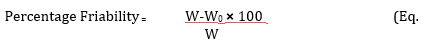 The friability of tablets was determined using Roche Friabilator. It is expressed in percentage (%). Ten tablets were initially weighed and transferred into Friabilator. The Friabilator was operated at 25 rpm for 4 minutes or run up to 100 revolutions. The tablets were weighed again. The % friability was then calculated by